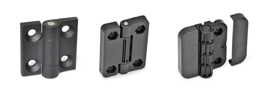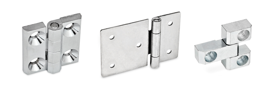 Scharniere mit Rastfunktion lagern und befestigen Türen und Klappen schwenkbar an Anlagen und Gehäusen. Die speziell ausgeprägte Scharnierlagerung ermöglicht eine Rastfunktion, mit der das Scharnier per federbelasteter Rastung geschlossen und bei bestimmten Öffnungswinkeln gehalten wird.
