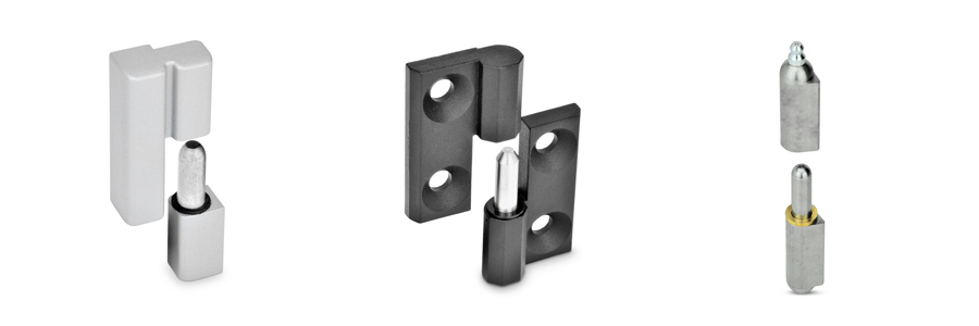 Aushängbare Scharniere lagern und befestigen Türen und Klappen schwenkbar an Anlagen und Gehäusen. Sie bestehen aus zwei Scharnierhälften, haben je nach Form einen fest fixierten oder einen losen Scharnierstift und lassen sich dadurch aushängen. Das erleichtert die Montage wenn mehrere Scharniere parallel angebracht werden oder die Türe sehr schwer ist.