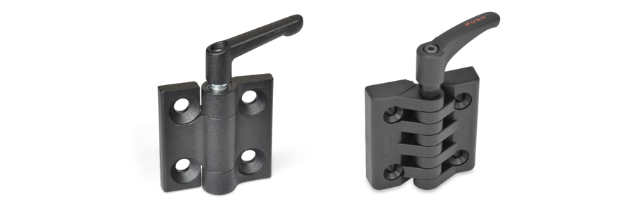 Feststellbare Scharniere lagern und befestigen Türen und Klappen schwenkbar an Anlagen und Gehäusen. Die speziell ausgeprägte Scharnierachse ermöglicht eine Klemmfunktion mittels Klemmhebel, so dass das Scharnier in jeder beliebigen Scharnierstellung festgestellt werden kann.