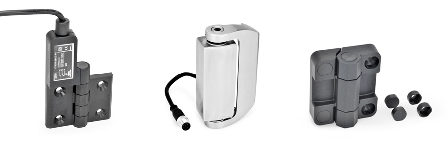 Scharniere mit elektrischer Schaltfunktion lagern und befestigen Türen und Klappen drehbar an Anlagen und Gehäusen mit dem zusätzlichen Effekt, dass integrierte, elektrische Sicherheitsschalter die Zustandsüberwachung ermöglichen. Beim Öffnen der Tür werden mehrere Schaltkontakte betätigt, welche dann z.B. einen Schutzkreis unterbrechen und gleichzeitig das Öffnen signalisieren.