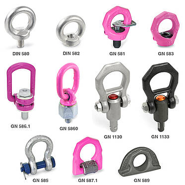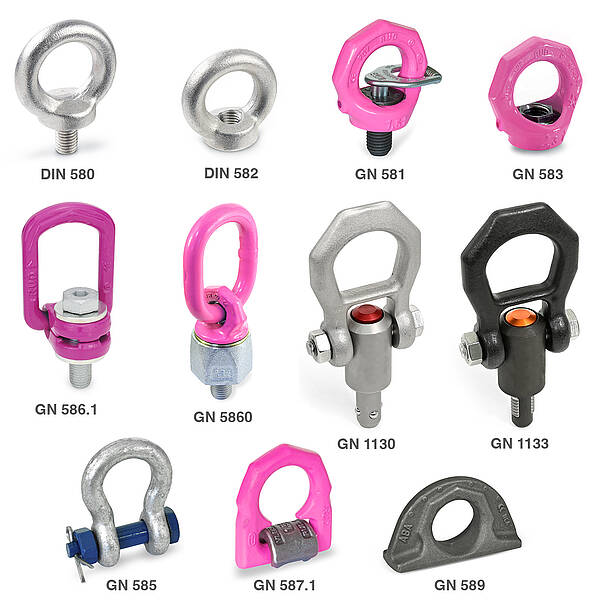 Als klassische und gleichsam einfachste Anschlagpunkte gelten die Ringschrauben nach DIN 580 – sie werden lastseitig in vorhandene Gewinde eingedreht. Dort wo keine Gewinde möglich sind, werden Ringmuttern nach DIN 582 analog eingesetzt. Ganter bietet diese Normen in drei Werkstoffen an: Stahl, Edelstahl A2 und A4.
