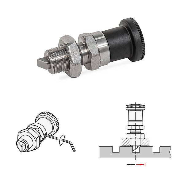 Bestellbar sind die neuen Rastbolzen unter der Norm GN 824, mit axialer Gewindefixierung und schwarzem Kunststoff-Knopf zur Betätigung. Damit die Anlauf-Rastung zuverlässig abläuft, baut Hanser Raststifte aus gehärtetem und robustem Edelstahl mit quadratischem Querschnitt und gängiger Dimensionierung ein. Wie immer denken die Entwickler alle Details mit: Wird der Rastbolzen über eines der Standard-Gewinde M12 … M20 eingeschraubt und gekontert, dann nimmt die Anlaufschräge zunächst eine willkürliche Winkellage ein. Damit diese tatsächlich senkrecht auf ihr Gegenüber auftrifft, kann der Raststift um 360 Grad justiert werden – ganz einfach durch Lösen eines Gewindestifts im Sockelring.