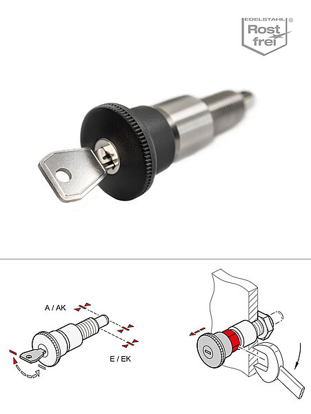 I pistoncini di posizionamento a molla con serratura GN 814 in acciaio inox antiruggine presentano le apprezzate funzionalità di base dei vari pistoncini di posizionamento a molla di Hanser. La novità è rappresentata è la combinazione intelligente con una funzione di sicurezza supplementare che permette la chiusura. A questo scopo nel pulsante in plastica di colore nero è integrata una serratura. Un movimento di chiusura di 180 gradi e la rimozione della chiave assicurano nella forma A e AK il puntale in posizione anteriore e impediscono il comando dalla posizione di base. Nella forma E ed EK il puntale può essere assicurato in aggiunta anche in posizione posteriore e garantisce quindi anche un blocco richiudibile in casi e situazioni in cui il puntale temporaneamente non può sporgere. In tutte le forme la chiave può essere rimossa anche nella posizione non richiusa, per impedire una chiusura non autorizzata dell’applicazione.