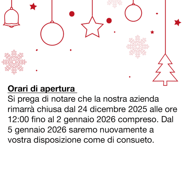 Si prega di notare che la nostra azienda rimarrà chiusa dal 24 dicembre 2025 alle ore 12:00 fino al 2 gennaio 2026 compreso. Dal 5 gennaio 2026 saremo nuovamente a vostra disposizione come di consueto.